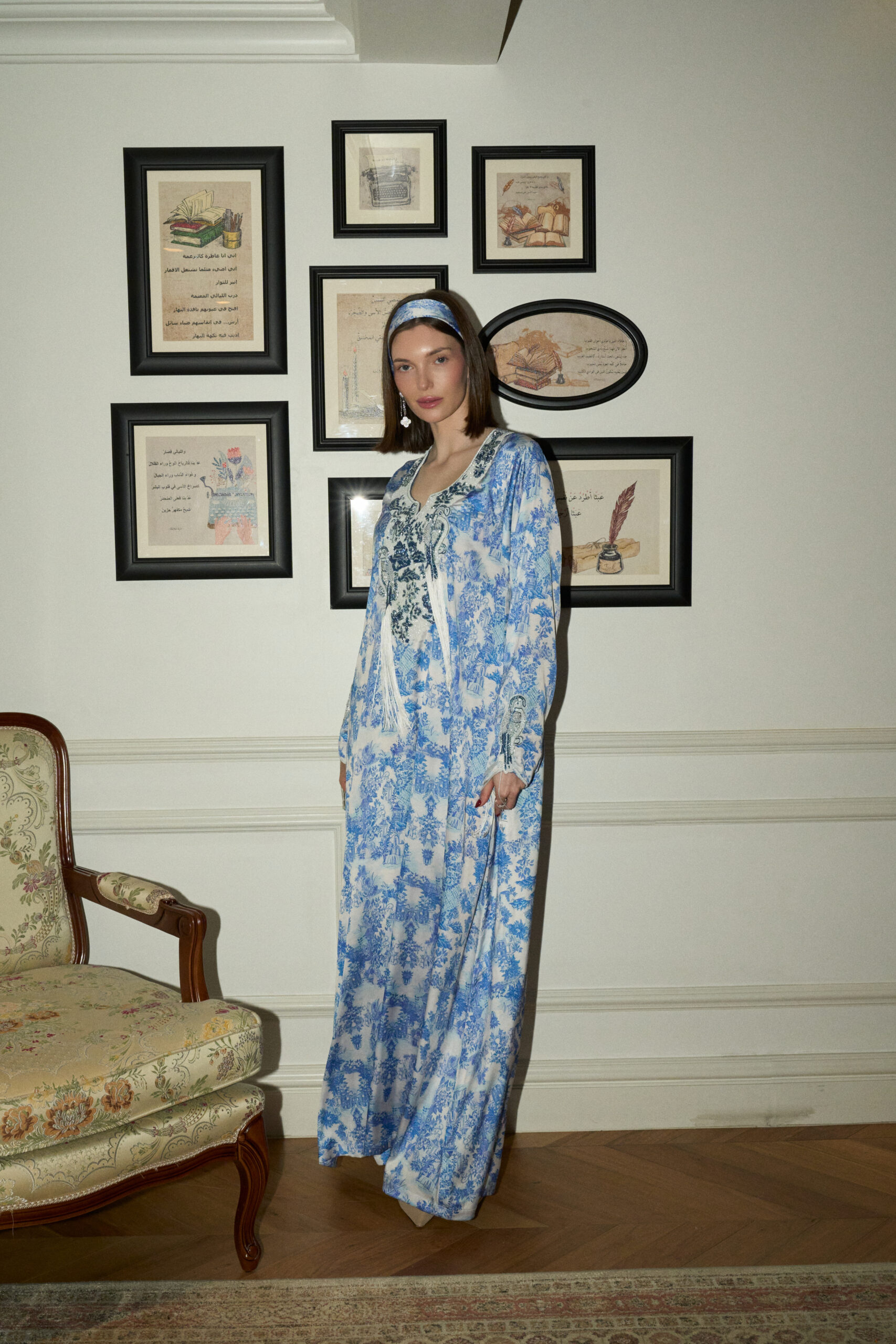 مطبوع على حرير ناعم، يتدفق Bluebird بألوان زرقاء ناعمة مع زخرفة طائر رقيقة منسوجة في التصميم. تفاصيل التطريز الدقيقة والشرّابات الخفيفة تتدلى بشكل طبيعي عند خط العنق، مما يضفي حركة وملمسًا رقيقين.