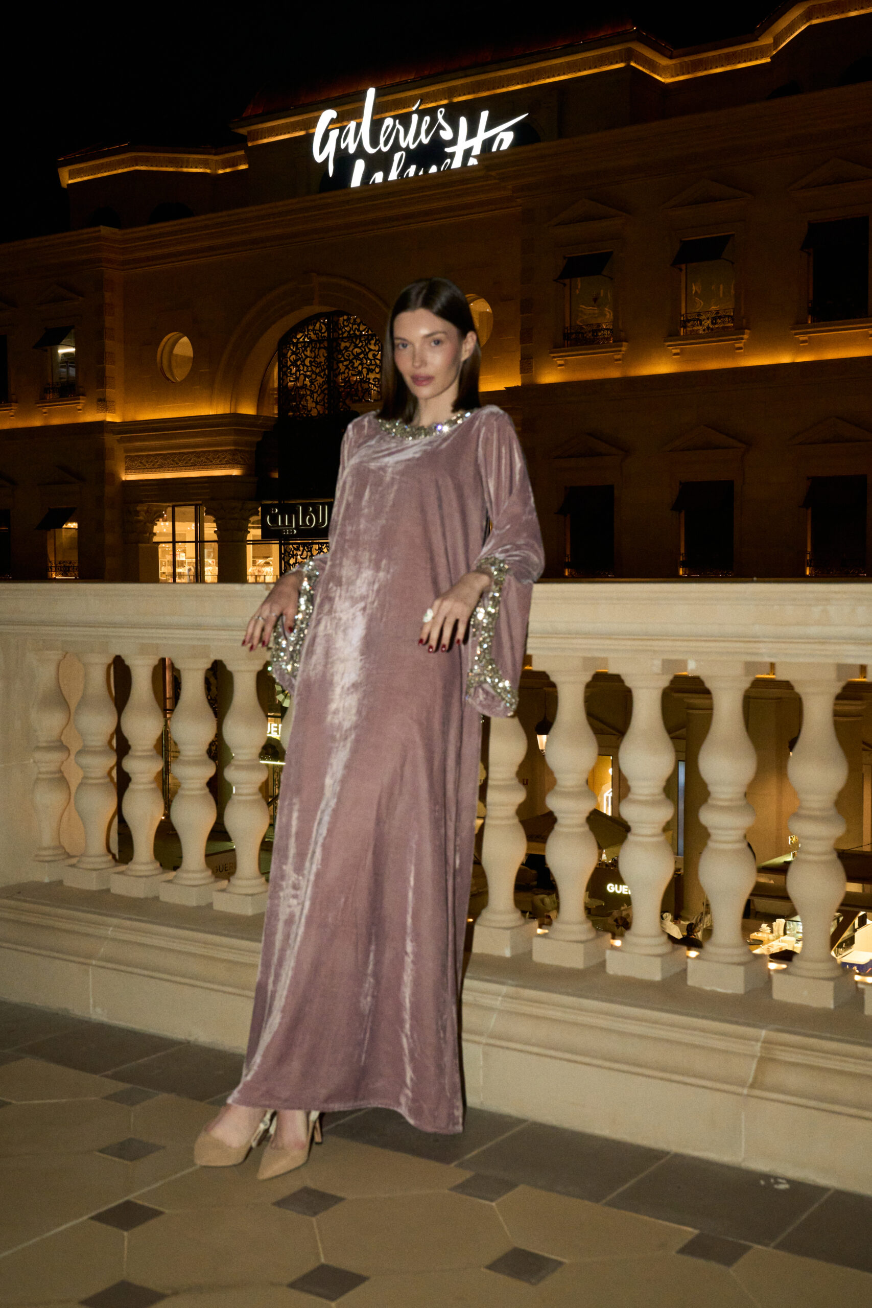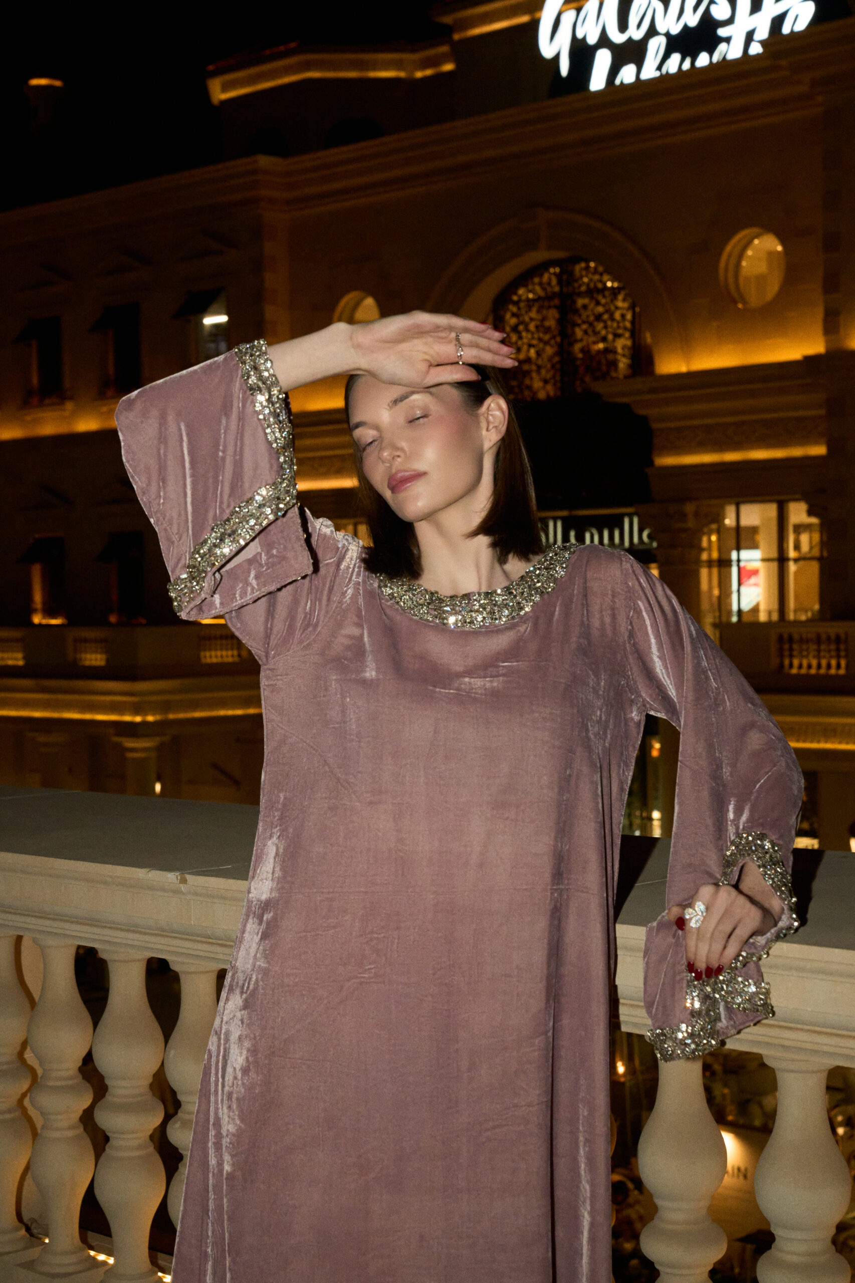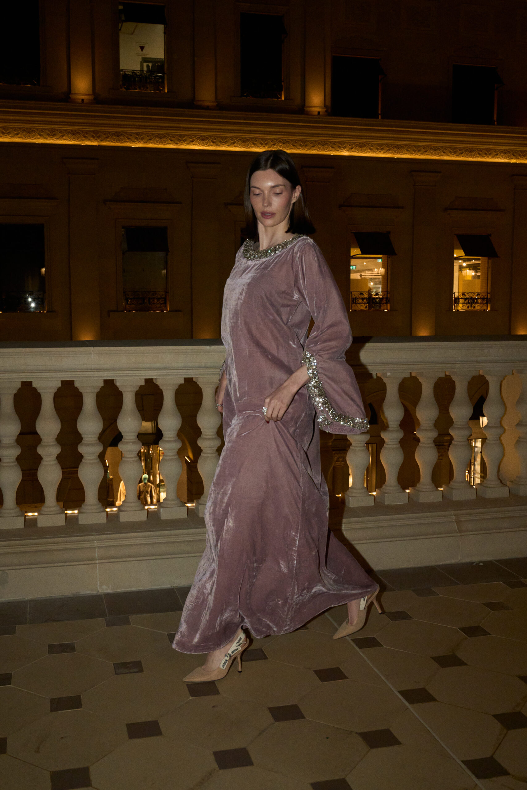 Amber is crafted in smooth velvet with a gentle, luminous sheen. Fine embellishment frames the neckline and sleeves, adding subtle light and refined balance.