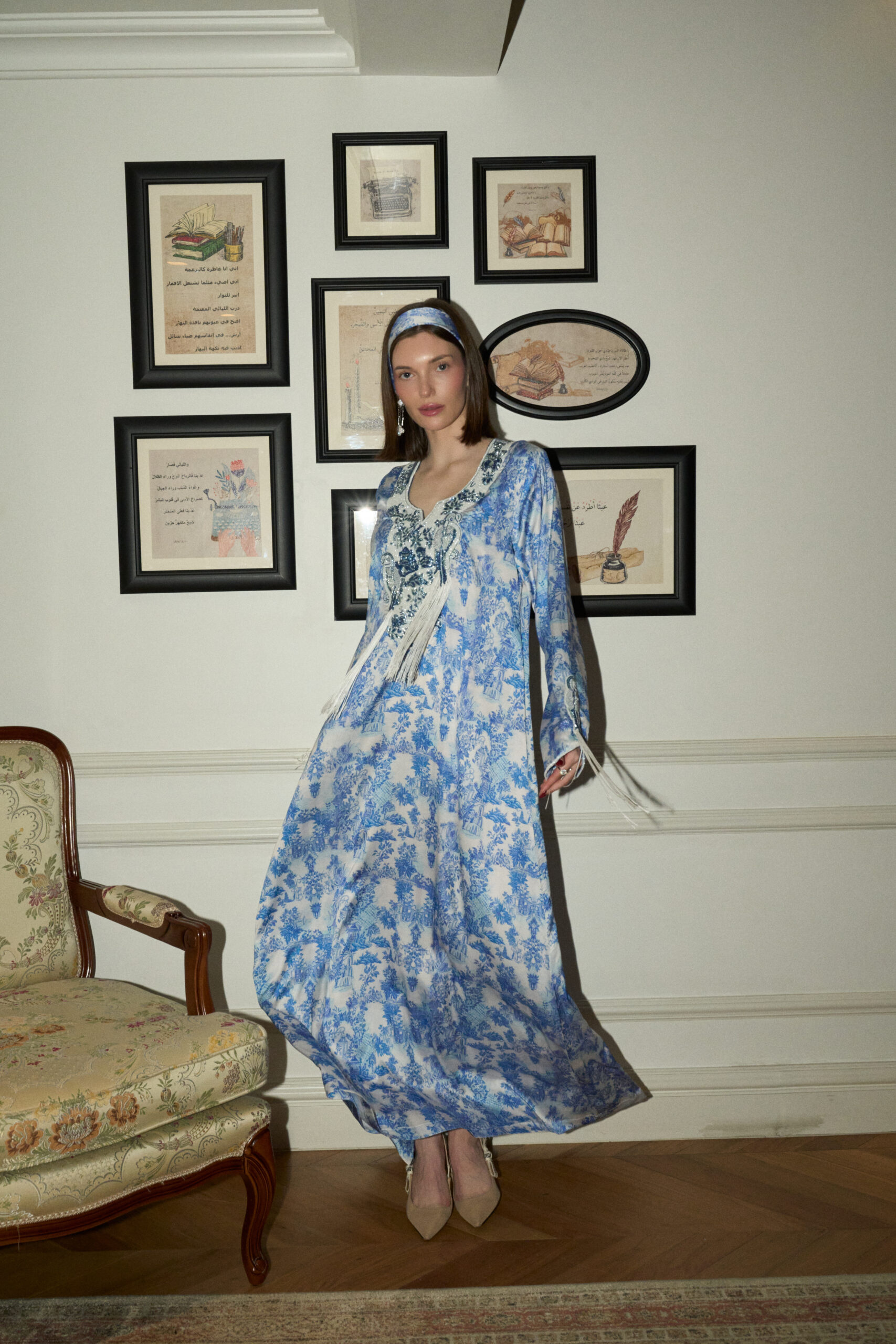 Printed on fluid silk, Bluebird flows in soft blue tones with a gentle bird motif woven into the design. Fine embroidery and light tassel details fall naturally at the neckline, adding subtle movement and texture.