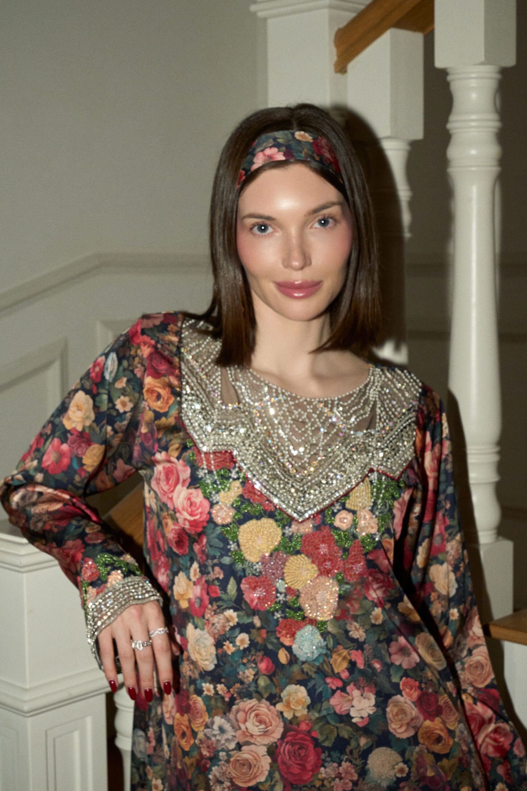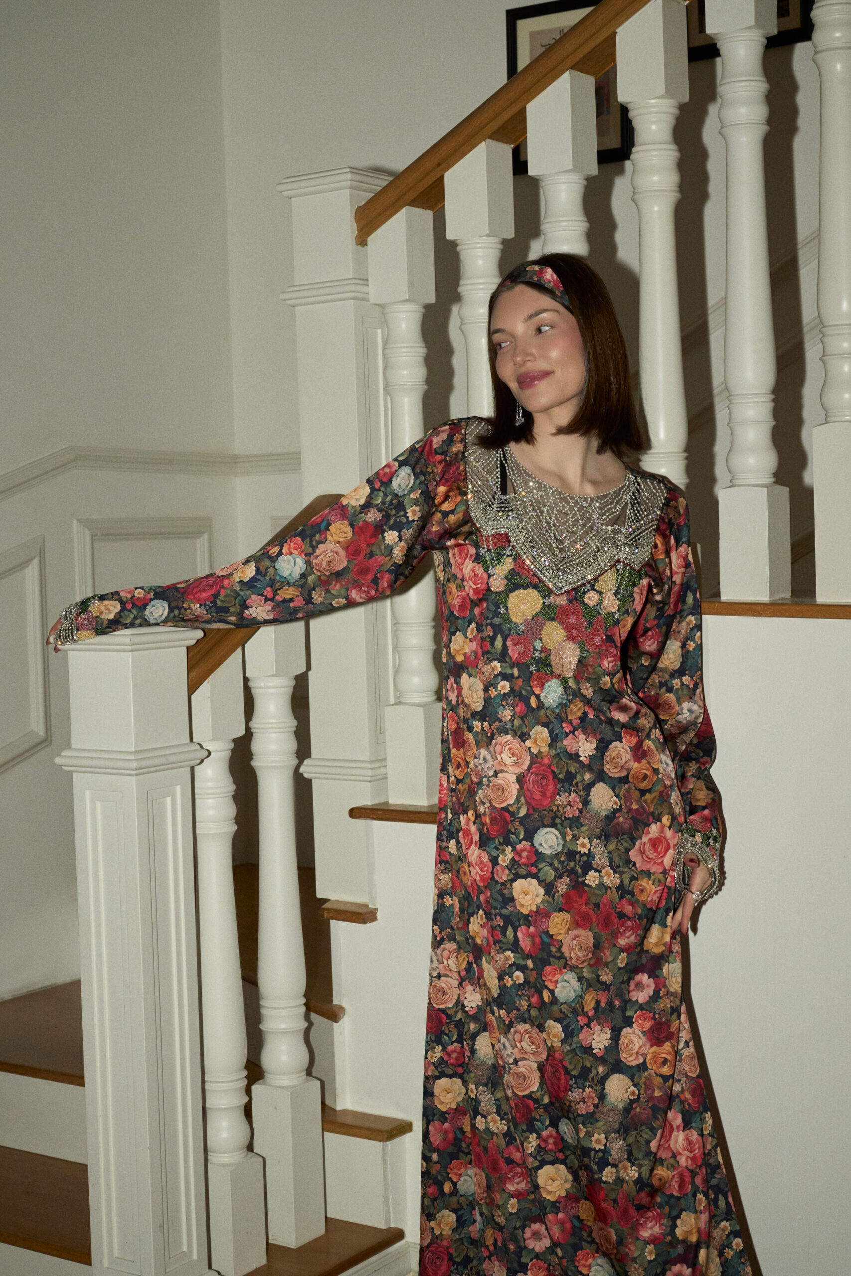 across the fabric, creating depth and quiet beauty. Fine hand embellishments trace the neckline and cuffs, catching the light with subtle ease.