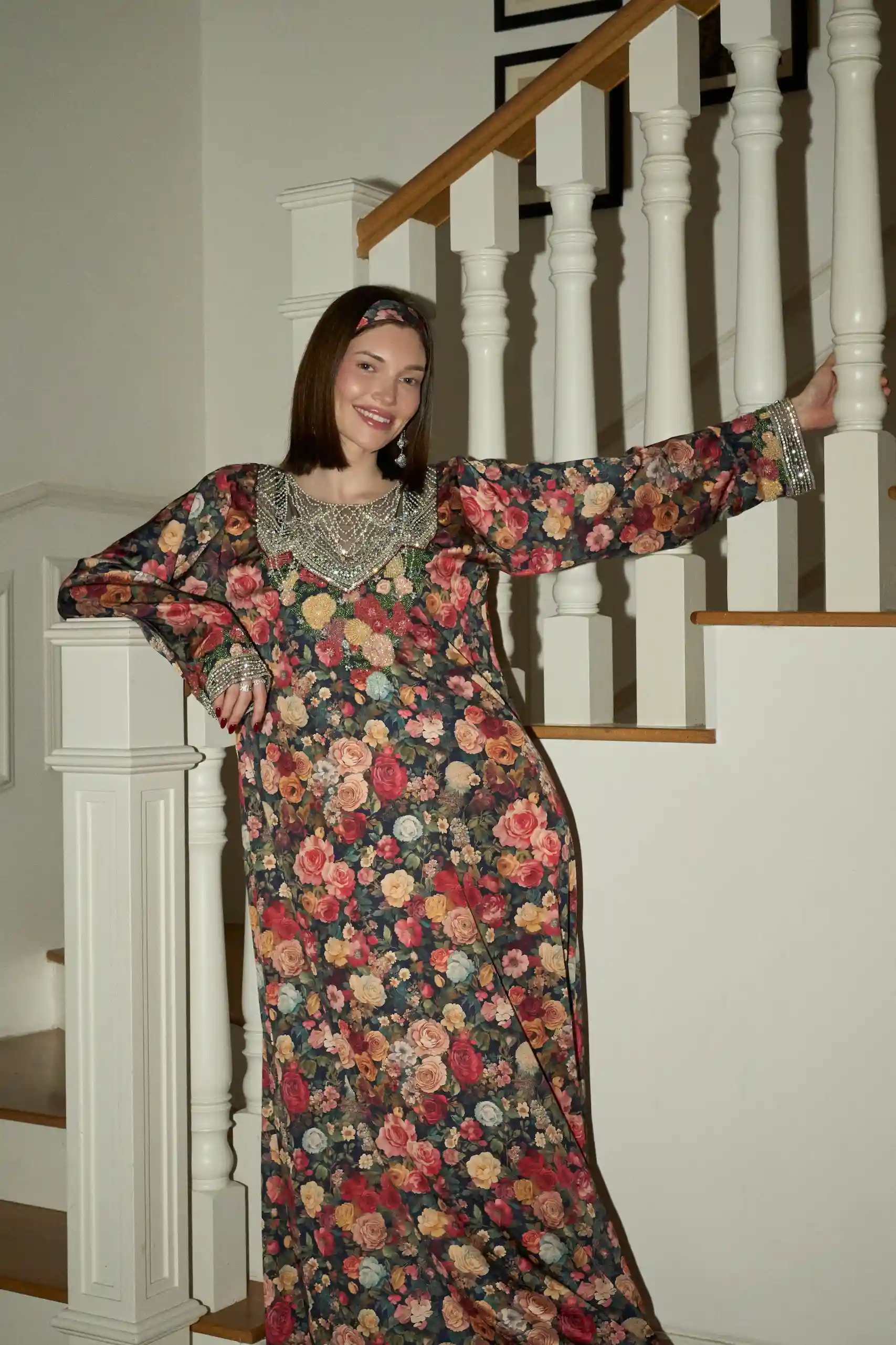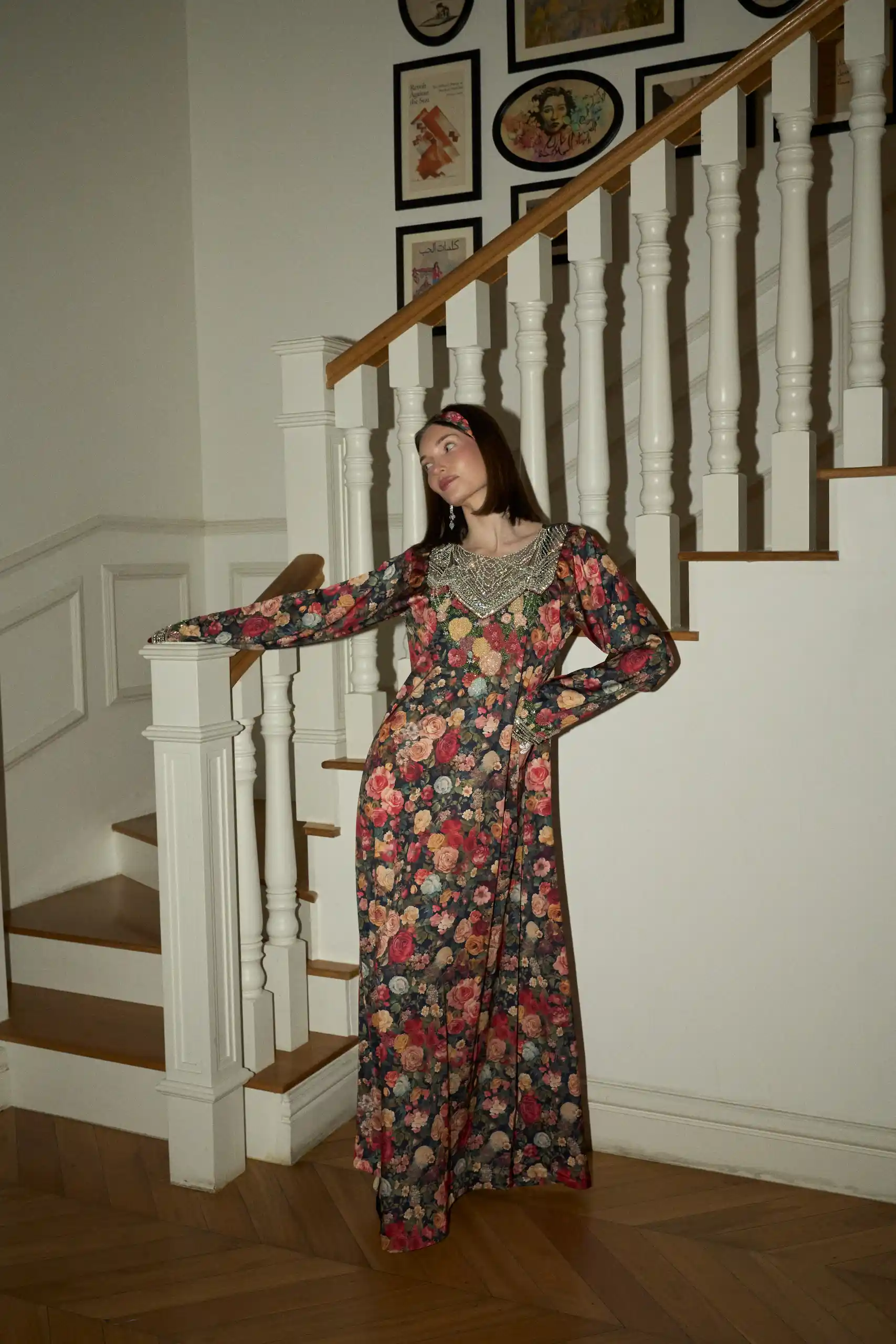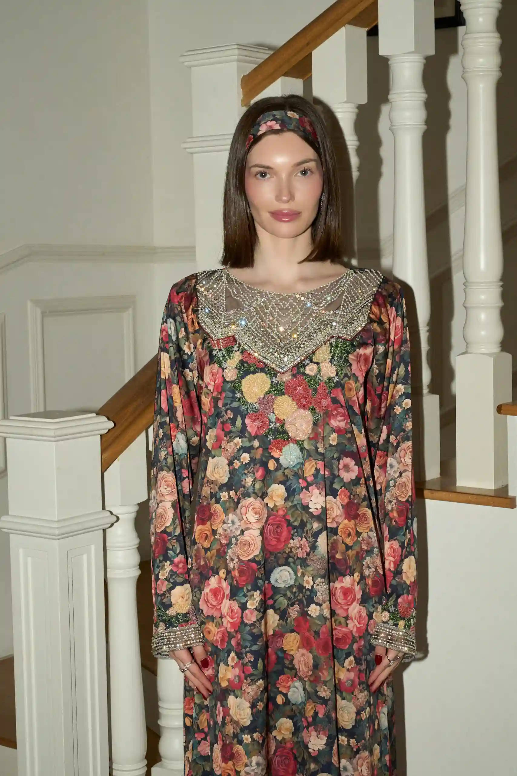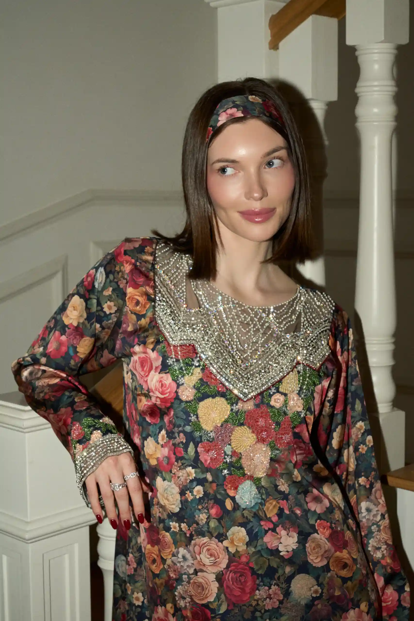 across the fabric, creating depth and quiet beauty. Fine hand embellishments trace the neckline and cuffs, catching the light with subtle ease.