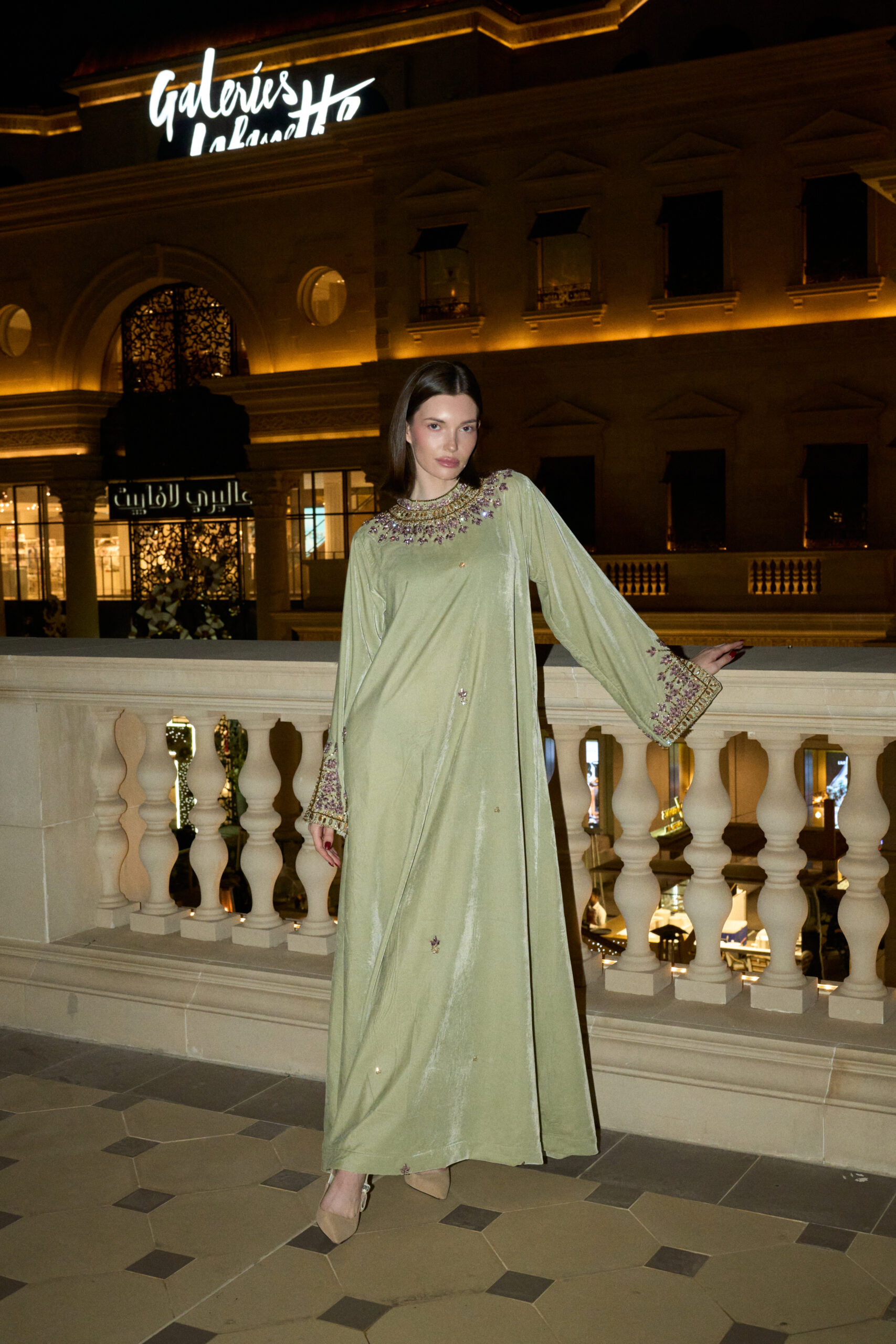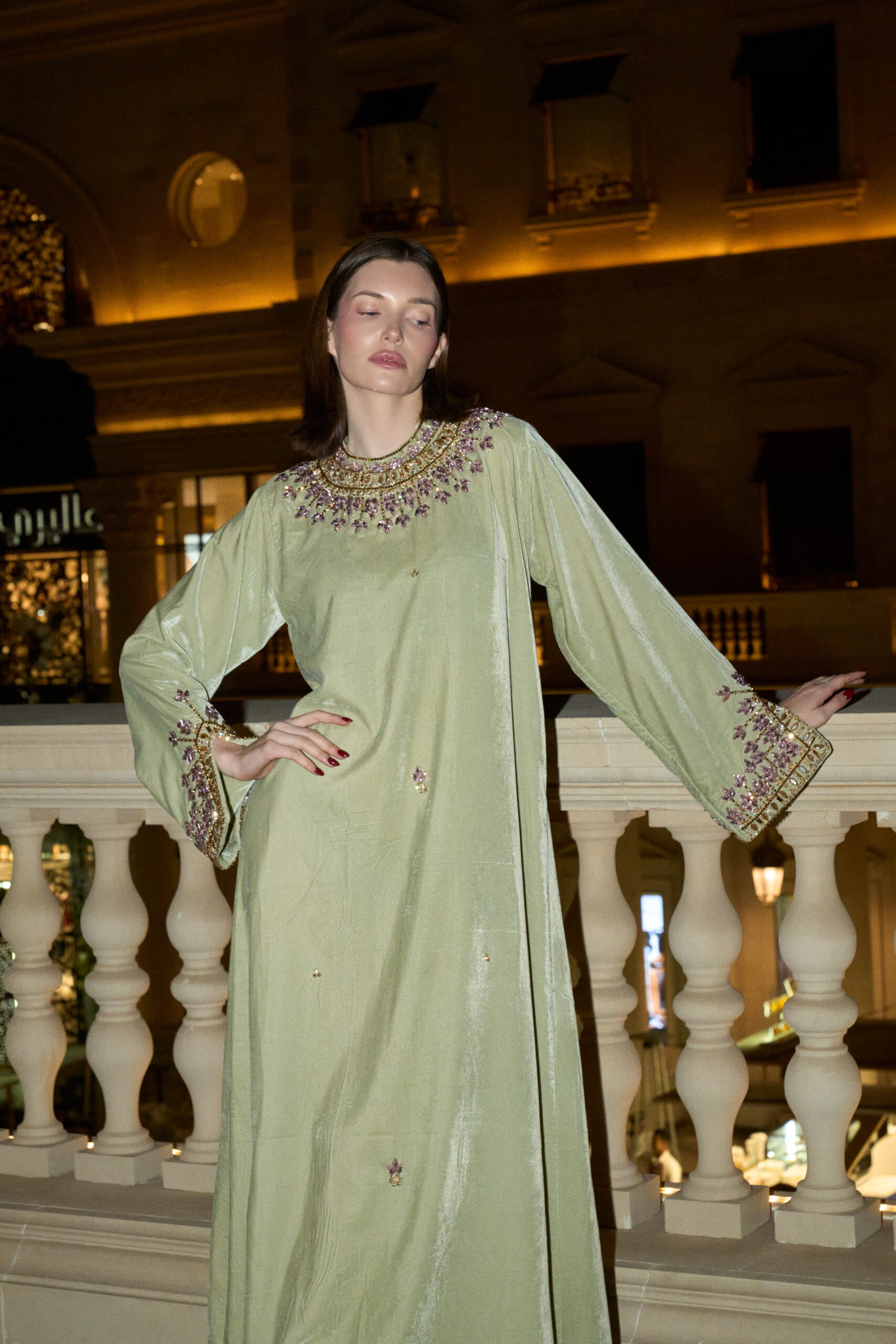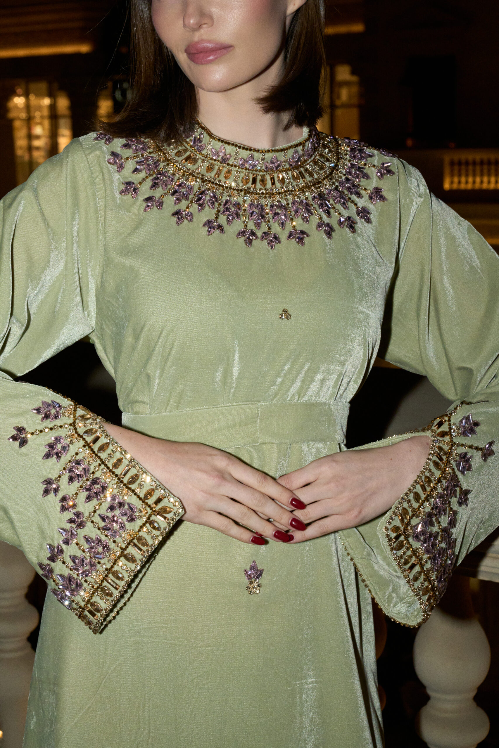 Jade is crafted in soft velvet with a gentle green tone that reflects light naturally. Delicate lilac and gold embroidery frames the neckline and cuffs, adding subtle contrast and quiet detail.