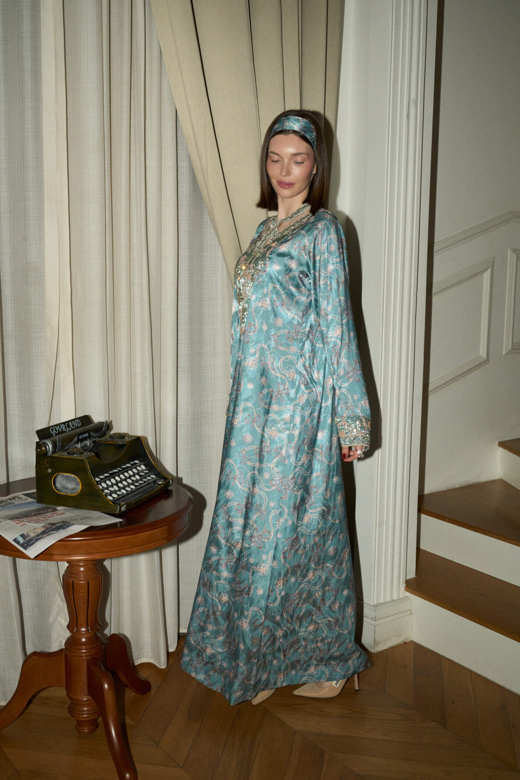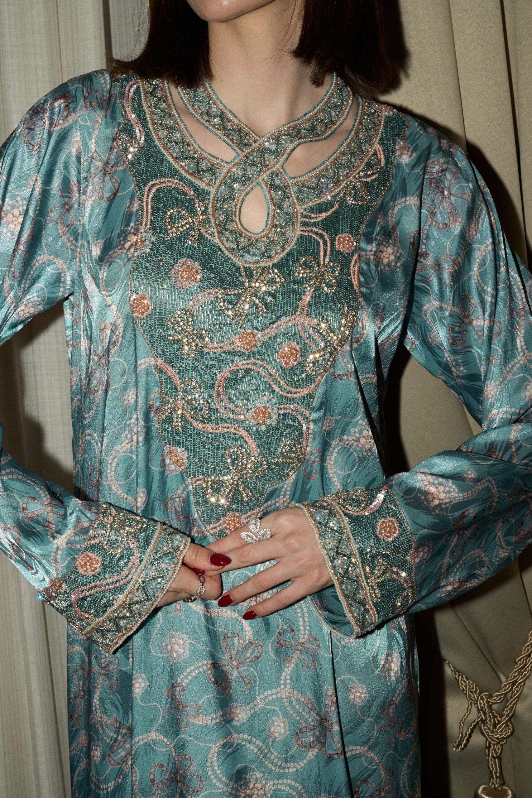 Mira flows in gentle sea-green tones with delicate detailing throughout. Fine embellishments trace the neckline and sleeves, finished with a soft fionka detail that adds a quiet, feminine touch.