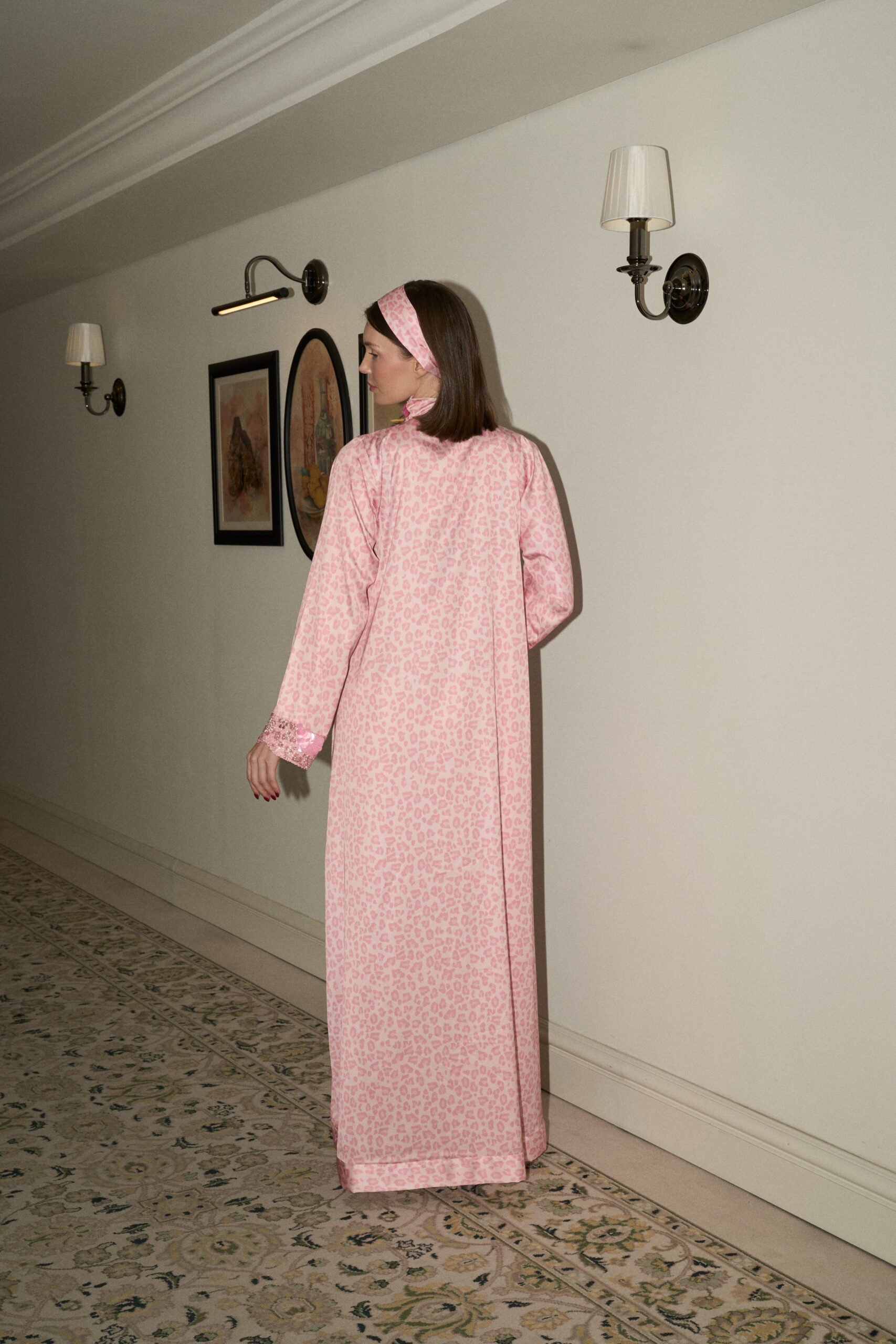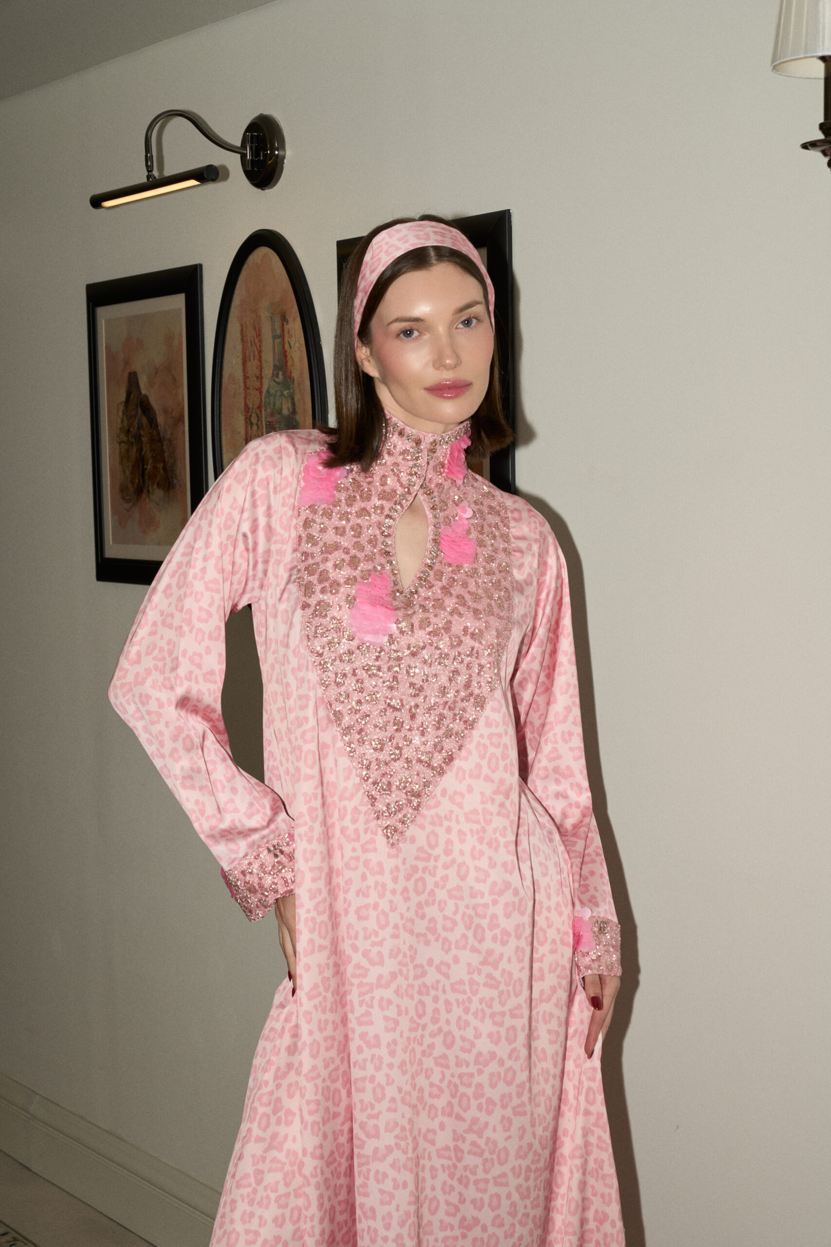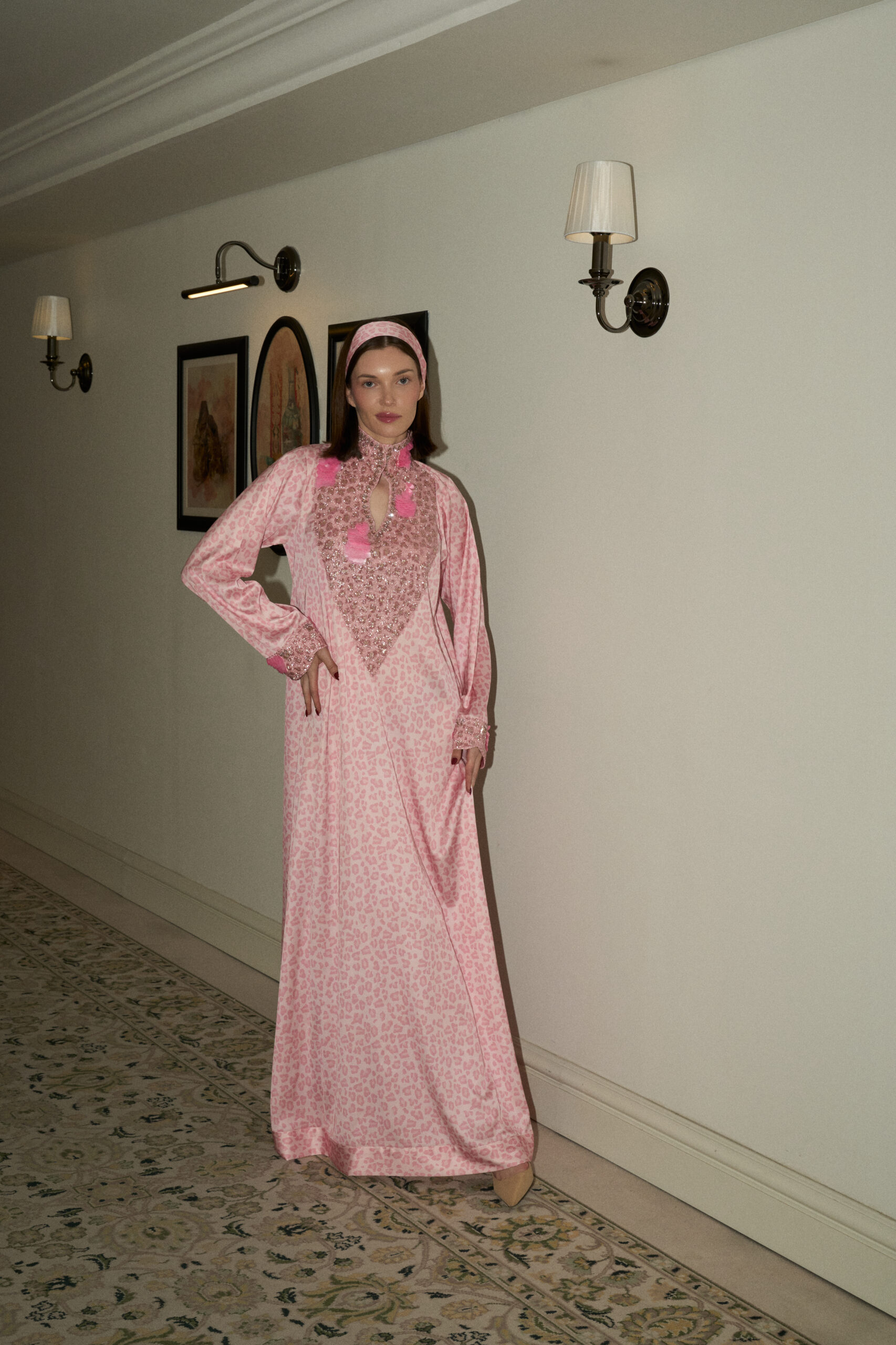 Panthera is a bold expression of femininity with an untamed edge. Crafted in luminous silk, its soft pink base is layered with a refined tiger pattern, blending wild energy with elegant grace. Hand-embellished details shimmer across the neckline and cuffs, adding a radiant contrast that elevates the design.