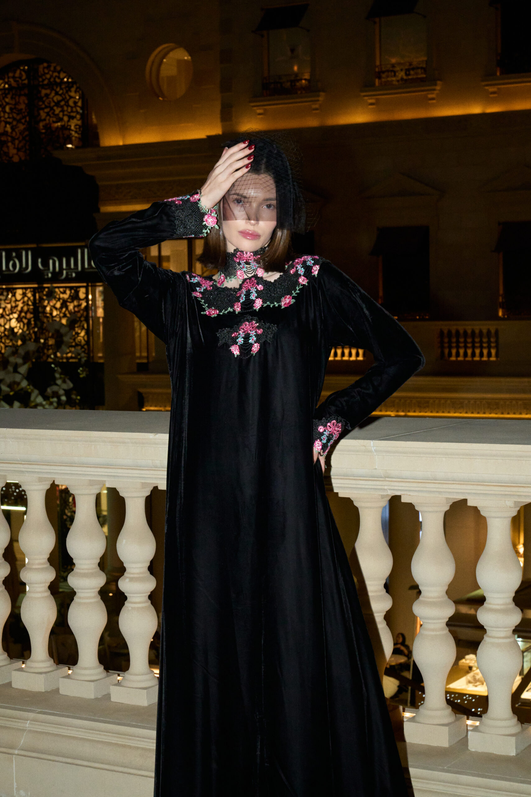 Paris is crafted in deep black velvet, enriched with fine French lace delicately adorned with crystal details woven into the dentelle itself. The crystals catch the light gently, creating a soft shimmer that feels like a dreamy night in motion. Rich texture meets subtle sparkle, giving the piece depth, elegance, and quiet allure.