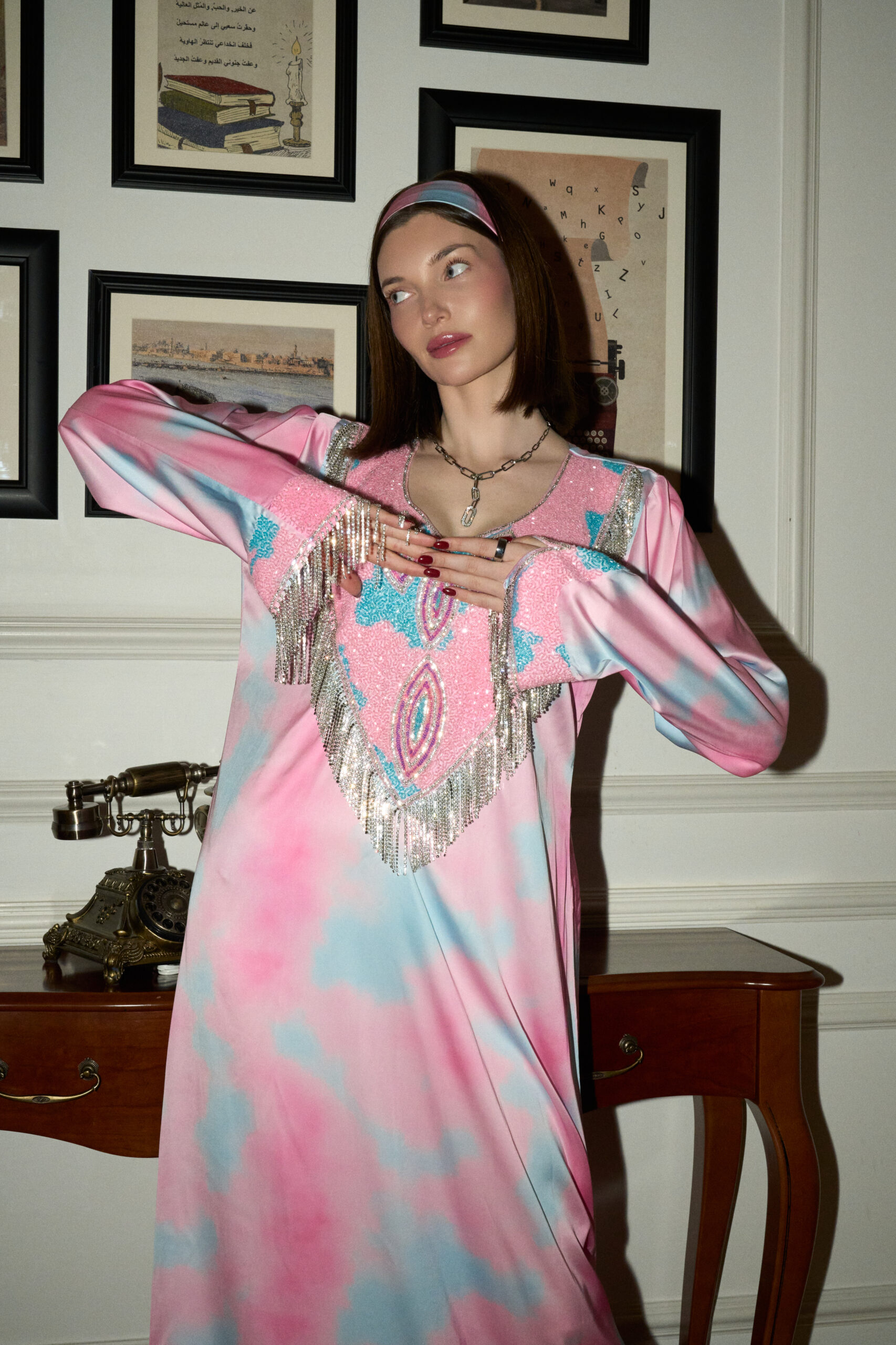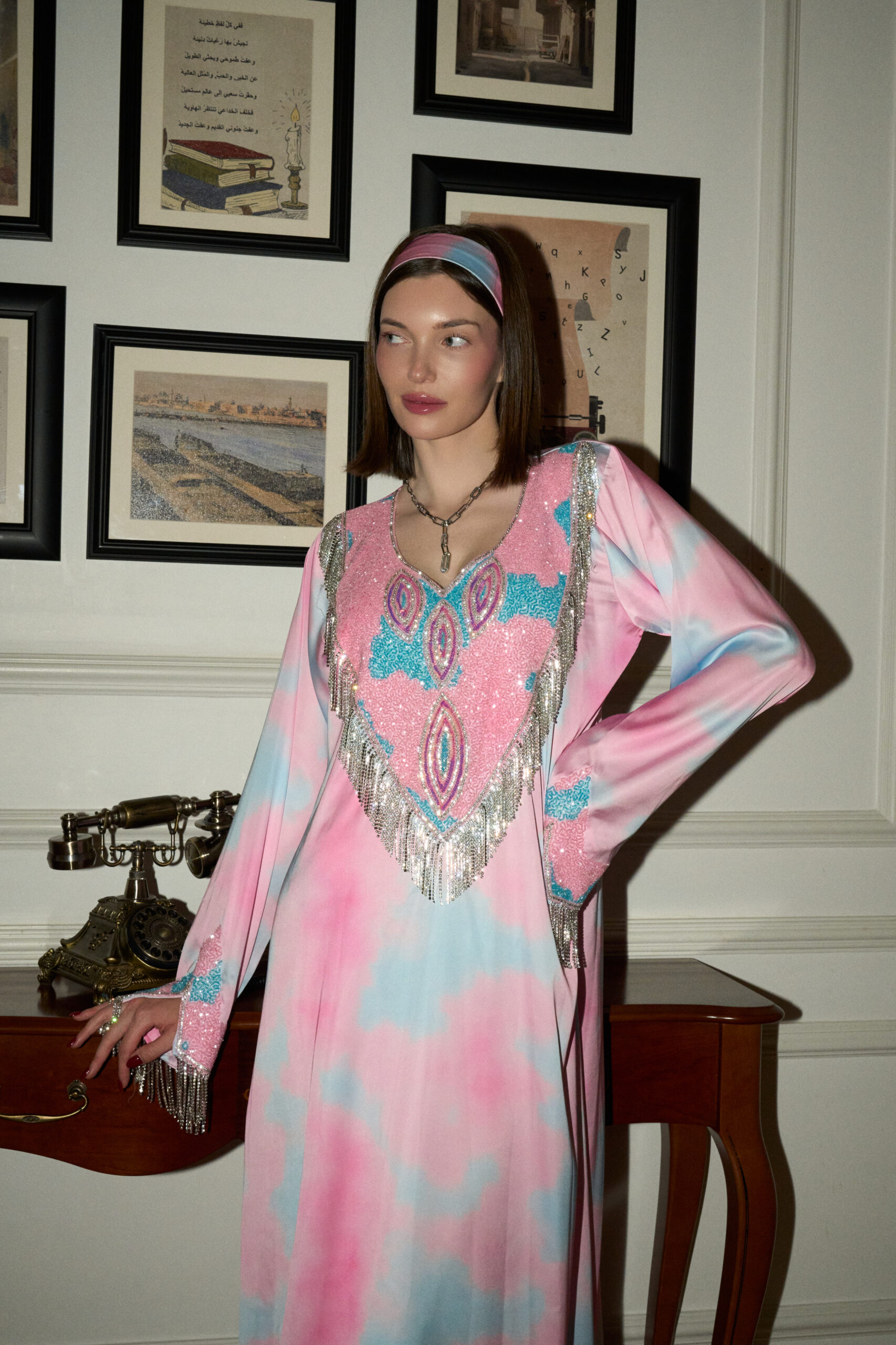 Valentina is pure radiance in motion. Crafted in fluid silk, its luminous blush and soft sky tones create a dreamlike palette, brought to life with cascading hand-embellished brilliance. Every detail is designed to catch the light — and every gaze.